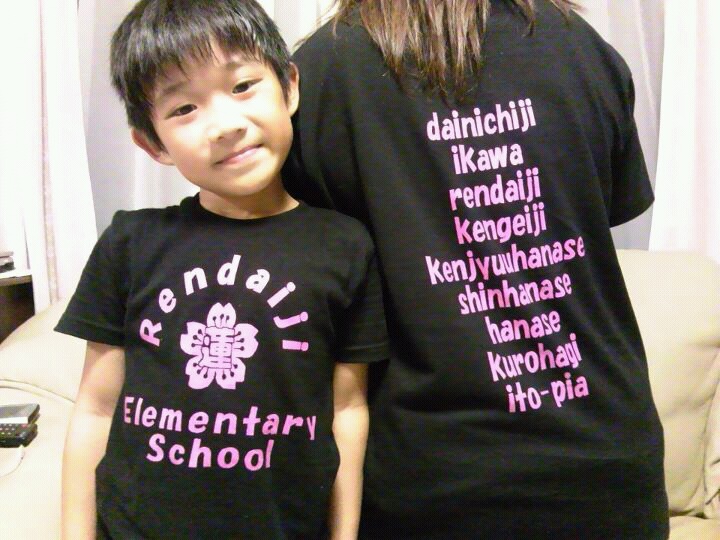 黒Tシャツにピンクのかなりいい感じの蓮台寺小学校のPTATシャツ♪